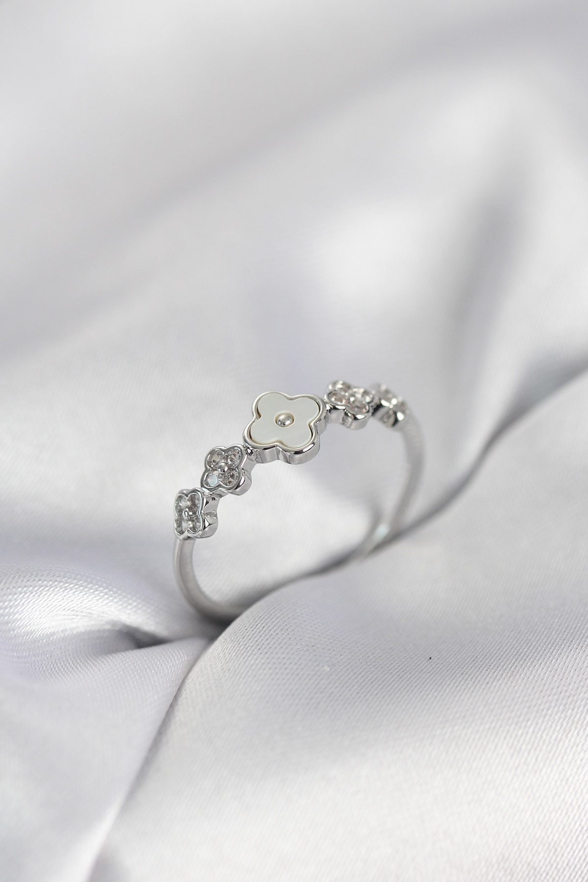 Gümüş Renk Minimal Yonca ve Zirkon Taşlı Kadın Yüzük - TJ-BYK4057