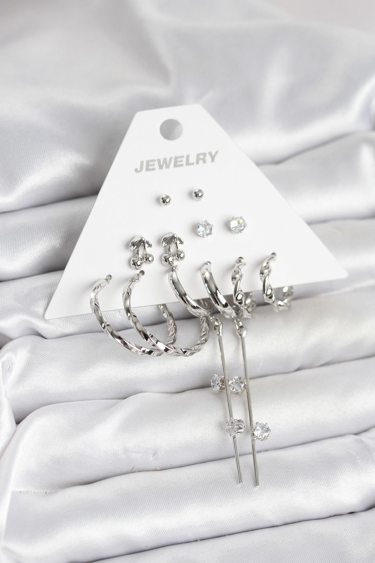 Gümüş Renk Pirinç 6'lı Kadın Küpe Seti - TJ-BKP11341
