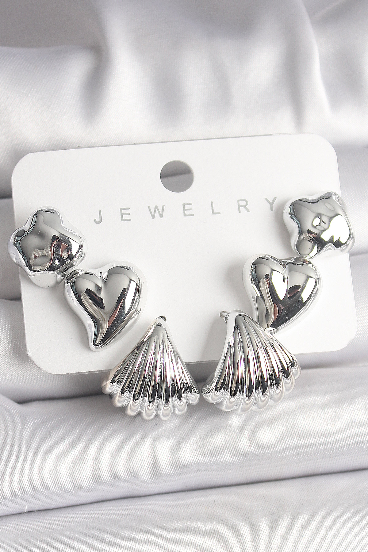 Gümüş Renk Yonca Kalp Deniz Kabuğu Figür CCB Kadın Küpe Seti - TJ-BKP10021