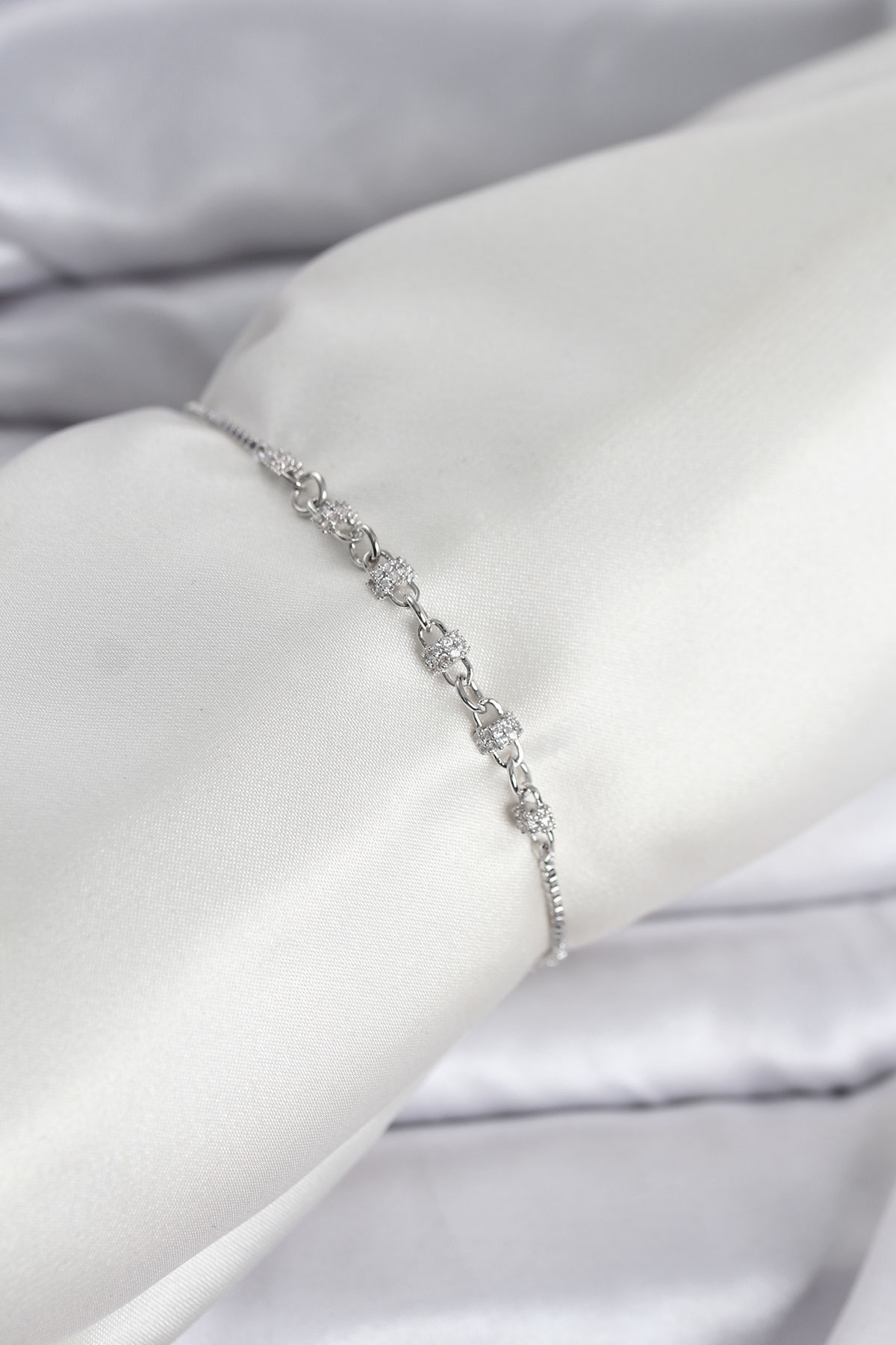Gümüş Renk Zincir Model Zirkon Taşlı Pirinç Asansörlü Kadın Bileklik - TJ-BB8331