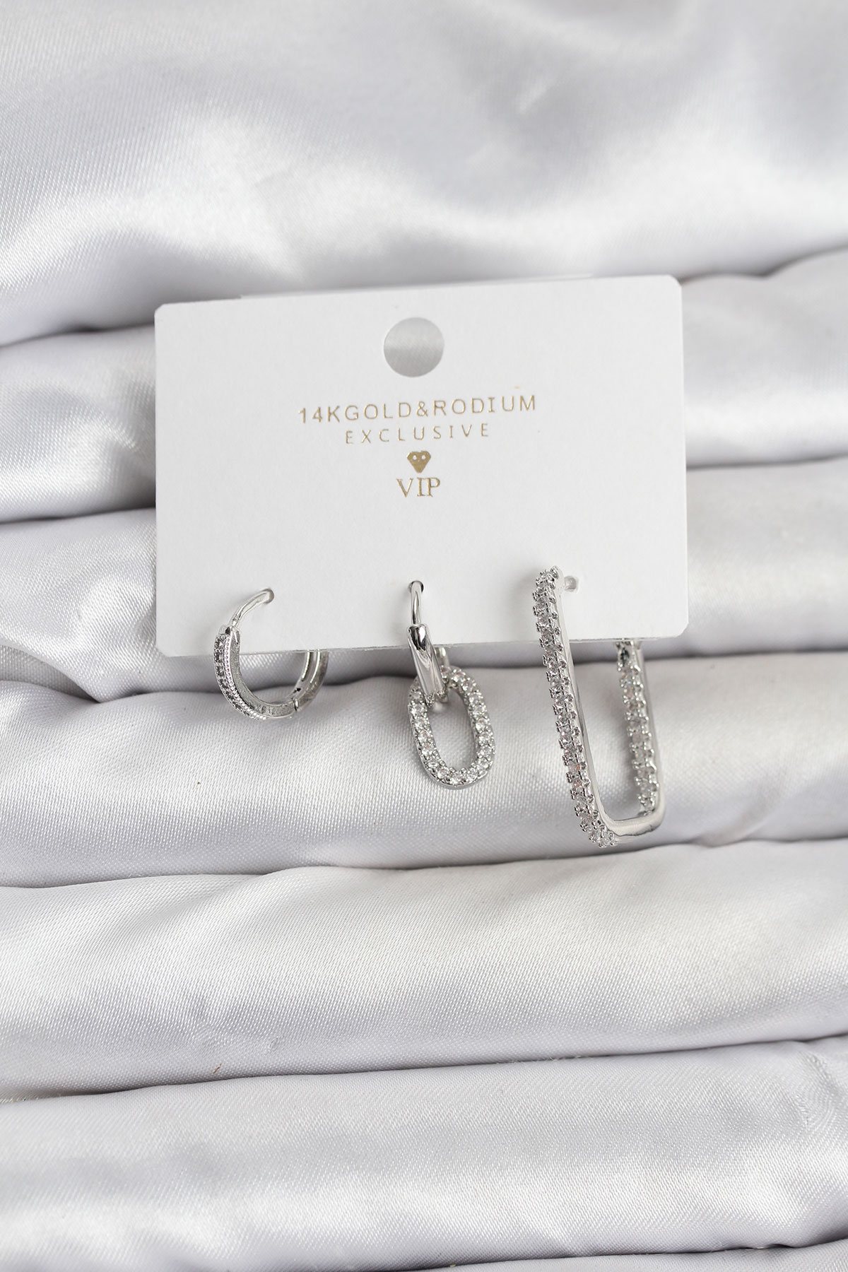 Gümüş Renk Zirkon Taşlı 3'lü Kadın Küpe Seti - TJ-BKP11450