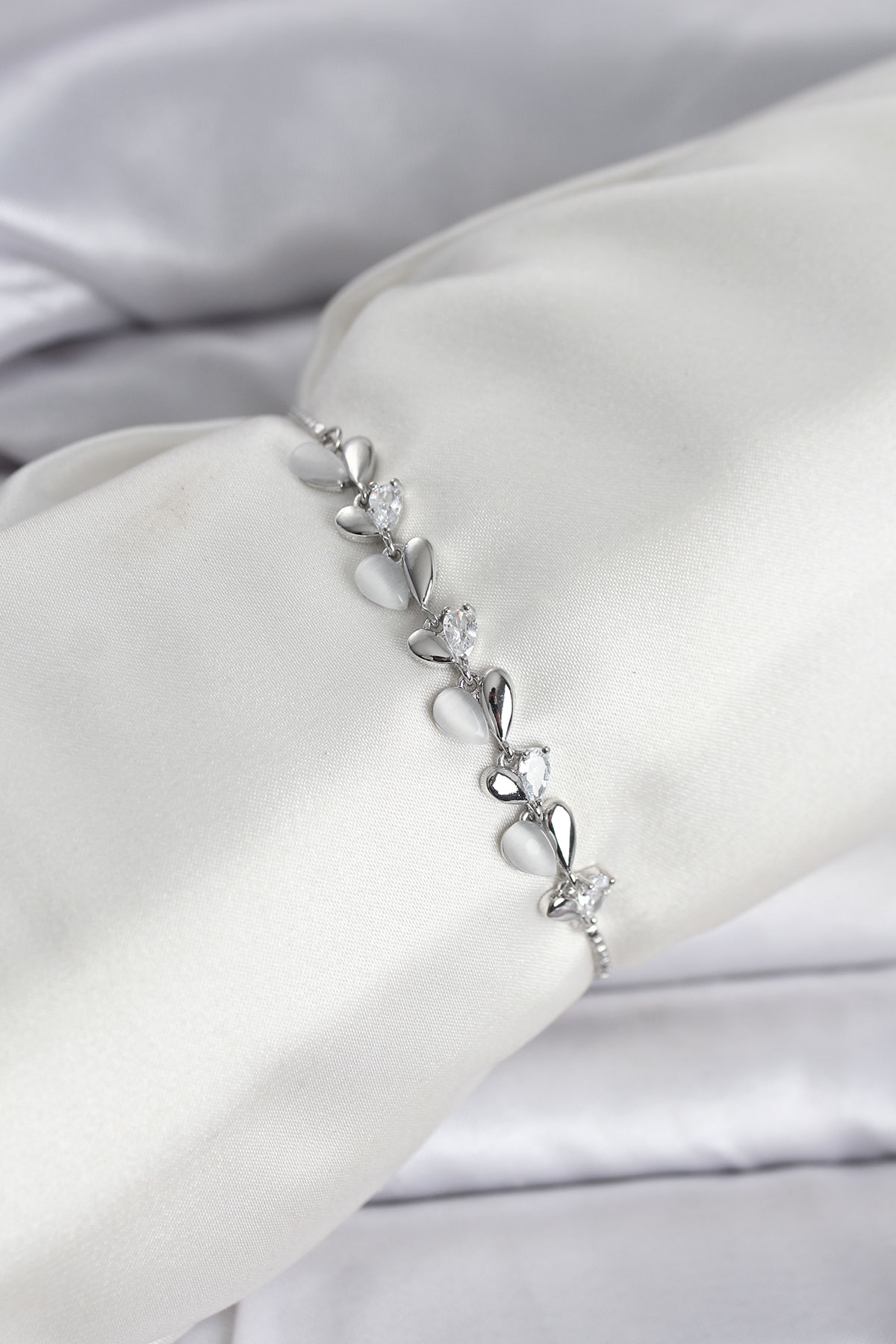Gümüş Renk Zirkon Taşlı Sıralı Damla Model Asansörlü Kadın Bileklik - TJ-BB8337