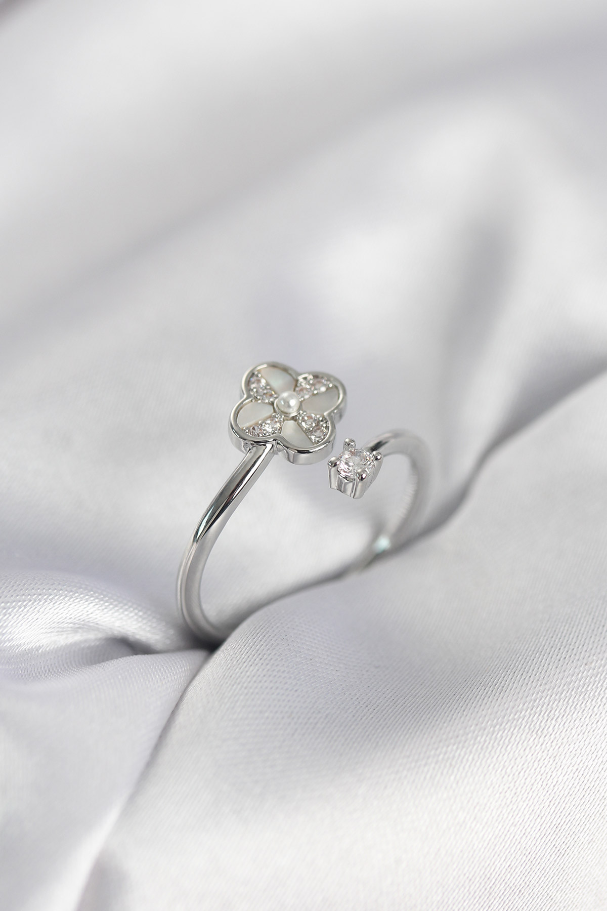 Gümüş Renk Zirkon Taşlı Yonca Model Kadın Yüzük - TJ-BYK4006
