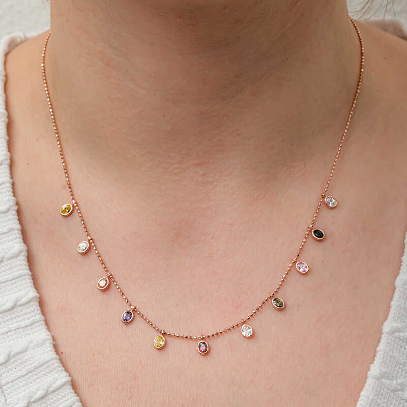 Kalbimizin ve ruhumuzun en eğlenceli tarafı olan rengarenk hayal dünyamızın yansıması özel tasarım renkli kolyeler... Bu şık kolyeyi doğum günü hediyesi, sevgililer günü hediyesi veya annelere hediye olarak özel günlerde tercih edilebilecek mükemmel bir seçenektir. Renkli kadın kolye 925 ayar gümüşten üretilmiştir.Gümüş üzerine rose kaplama yapılmıştır. Rose kaplama yapılan kadın şans kolyeleri parlaklığını uzun süre muhafaza eder ve oksitlenmesi gecikir. Tüm gümüş kolyelerde olduğu gibi gümüş renkli kadın kolye modeli de el emeği ile üretilmiştir. Gümüş ve değerli taşlar nedeniyle belirtilen ortalama ürün ağırlığında ± %10 sapma olabilmektedir.