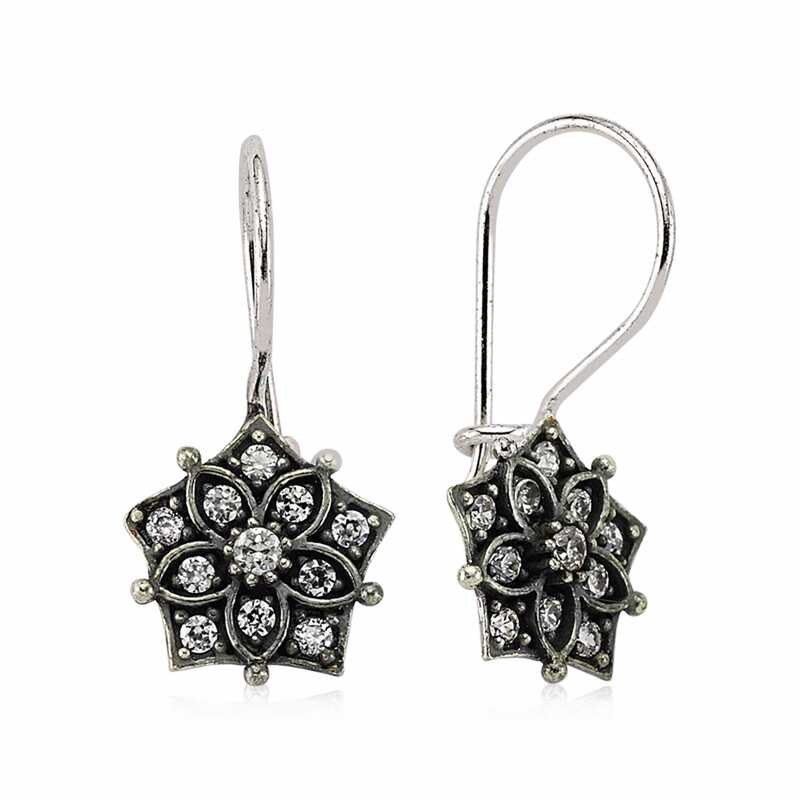 Işıl ışıl zirkon taşlarla süslenmiş bu şık ve modern küpe; göz alıcı çiçeklerle süslendi... Bu farklı tasarımı; doğum günü hediyesi, sevgililer günü hediyesi veya annelere hediye olarak özel günlerde tercih edebileceğiniz çok şık bir seçenektir. Küpe; 925 ayar gümüşten imal edilmiştir. Gümüş üzerine oksit kaplama yapılmıştır. Oksit kaplama yapılan gümüş sallantılı küpeler parlaklığını uzun süre muhafaza eder, kararması gecikir. Tüm gümüş küpe modellerinde olduğu gibi gümüş sallantılı çiçek küpe modeli de el emeği ile üretilmiştir. Üzerinde bulunan taşlar zirkondur. Gümüş ve değerli taşlar nedeniyle belirtilen ortalama ürün ağırlığında ± %10 sapma olabilmektedir.