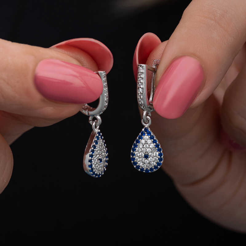 Nazar boncuğunu insanlar uzun yıllardan beri kötü bakıştan korunmak için kullanmışlardır. Kötü bakışların insanlar üzerinde olumsuz etki oluşturmasına karşı bir önlemdir nazar boncuğu… Bu sebeptendir ki insanlar sevdiklerini korumak için nazar boncuğu takmaktadır. Bu nazar küpe de şıklığı ve zarafeti yansıtıyor. Her dönem sevilen ve şıklığından ödün vermeyen bu modeli; doğum günü hediyesi, sevgililer günü hediyesi veya annelere hediye olarak özel günlerde tercih edebilirsiniz. Sallantılı nazar küpe modeli 925 ayar gümüşten imal edilmiştir. Gümüş üzerine rodyum kaplama yapılmıştır. Rodyum kaplama yapılan gümüş kadın küpeler parlaklığını uzun süre muhafaza eder, oksitlenmesi gecikir. Üzerinde bulunan taşlar zirkondur. Tüm gümüş kadın küpelerde olduğu gibi bu gümüş sallantılı damla nazar kadın küpe de tamamı el emeği ile üretilmiştir. Gümüş ve değerli taşlar nedeniyle belirtilen ortalama ürün ağırlığında ± %10 sapma olabilmektedir.