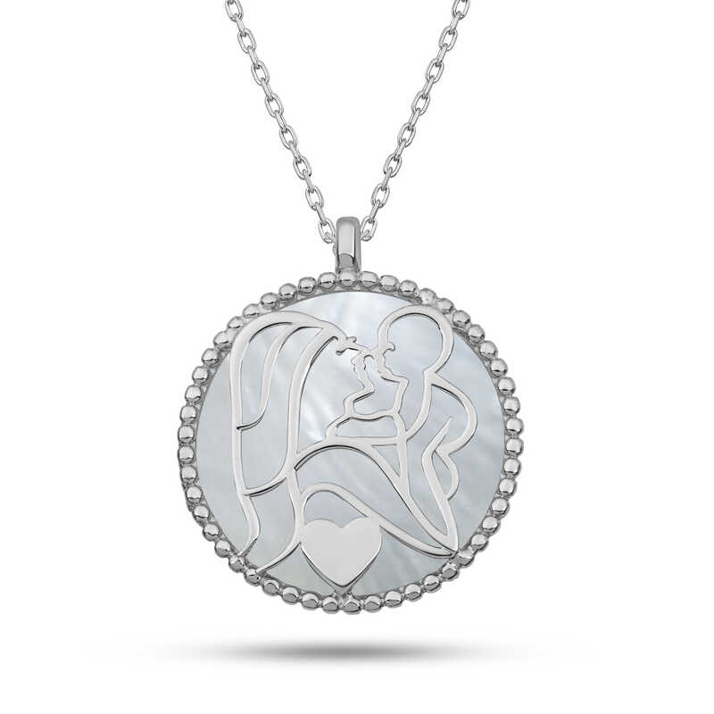 Çocuk ve anne arasındaki sevgiyi temsil eden özel bir tasarımdır.Bu kolye,sevgi,bağlılık ve şefkat duygularını ifade eder.Annenize olan bağlılığınızı belirtmek için alabileceğiniz en uygun hediyelerden biri bu anne ve bebek kolyesi olacaktır.Anneniz için tasarlanan bu özel tasarım sedef taşlı anne çocuk kolyesi 925 ayar gümüşten imal edilmiştir. Gümüş üzerine rodyum kaplama yapılmıştır.Rodyum kaplama yapılan gümüş anne çocuk kolye modelleri parlaklığını uzun süre muhafaza eder ve oksitlenmesi gecikir.Gümüş olan zincir boyu ortalama 45 cm'dir.Gümüş anne çocuk kolyesi el emeği ile üretilmiştir. Gümüş ve değerli taşlar nedeniyle belirtilen ortalama ürün ağırlığında ± %10 sapma olabilmektedir.