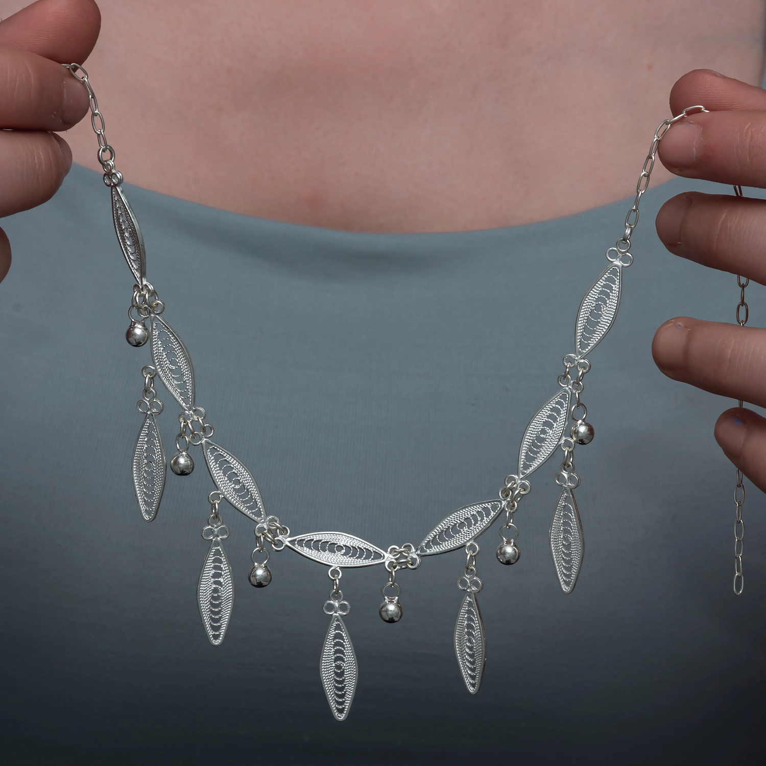 Gümüş Sonsuz Yaprak Telkari Kadın Kolye, doğadan ilham alan yaprak motiflerini geleneksel telkari sanatının inceliğiyle bir araya getirir. Uzun oval formlu telkari detaylar kolye boyunca zarif bir akış oluştururken, sallantılı gümüş top süslemeler tasarıma canlılık ve ışıltı katar. İnce ve dengeli yapısı sayesinde boyunda estetik ve feminen bir duruş sergiler.925 ayar gümüşten üretilen bu özel kolye, hafifliği sayesinde gün boyu konforlu bir kullanım sunar. Hem günlük kombinlere doğal bir zarafet katmak hem de özel günlerde şık bir tamamlayıcı olmak için ideal bir seçimdir. Ayarlanabilir zinciri farklı boy ölçülerine uyum sağlar. El işçiliği detayları ve zamansız tasarımıyla sevdikleriniz için de anlamlı bir hediye alternatifi olarak öne çıkar.Gümüş ve değerli taşlar nedeniyle belirtilen ortalama ürün ağırlığında ± %10 sapma olabilmektedir.