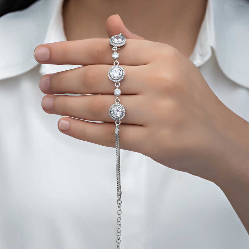 Gümüş ve zirkonun göz kamaştırıcı parlaklığı ile yıldızları anımsatmak isteyenlere bu tektaş bileklik çok yakışacak. 925 ayar gümüşten imal edilen bu bileklik hem sizin, hem de sevdiklerinizin keyifle takacağı spor ve klasik tüm kombinler için tercih edilebilir. Bileklik üzerindeki beyaz taş zirkondur. Dilerseniz kendinizi, dilerseniz sevdiklerinizi şık ve ışıl ışıl tek taş bileklik ile sevindirin. Gümüş tek taş kadın bileklik üzerine rodyum kaplama yapılmıştır. Rodyum kaplama yapılan tüm gümüş kadın bileklik modelleri parlaklığını uzun süre muhafaza eder. Bilekliğin zincir uzunluğu 21 cm dir. Tüm gümüş kadın bileklik modellerimizde olduğu gibi gümüş tek taş kadın bileklikte el emeği ile üretilmiştir. Gümüş ve değerli taşlar nedeniyle belirtilen ortalama ürün ağırlığında ± %10 sapma olabilmektedir.