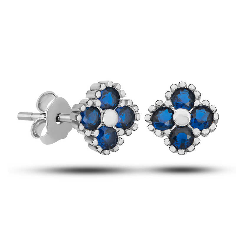 Gümüş Yonca Çivili Mavi Taşlı Çocuk Küpe