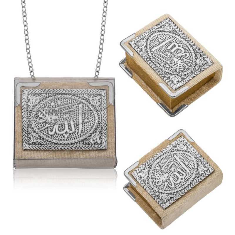 Gümüş Zincirli Küçük Kur'anı-ı KerimKur'an-ı Kerim, İslam dininin ana kitabıdır. Müslümanlara göre, Kur'an ayetleri Allah tarafından Cebrail adındaki melek aracılığıyla İslam peygamberi Muhammed'e vahiyler halinde indirilen bir kutsal kitaptır.İslam inancında, Kur’ân, Muhammed'in en önemli ve en büyük mucizesi ve onun gerçek bir peygamber olduğunun kanıtı olarak görülür. Kur'an-ı Kerim kapağı bordo kadife ve üzeri 925 ayar gümüş kaplamadır. Sayfaları altın yaldızlıdır. Zincirli Kur'an-ı Kerim araba aynasına ya da farklı yerlere asılarak da kullanılabilir. Sevdiklerinize manevi değeri olan bir hediye vermek istiyorsanız tercih edebileceğiniz hoş bir seçenektir.Ürün Eni: 5.00 cmÜrün Boyu: 6.00 cmÜrün Ağırığı: 50.00 grÜrünlerimizin tamamı el emeği ile üretilmiştir ve değerli taşlar nedeniyle ürün ağırlığında ± %10 sapma olabilmektedir.