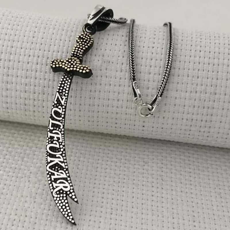 Hz. Ali Uhud savaşında çokca kahramanlık göstermiştir. Savaşta Peygamber Efendimizi korumak isterken kılıcı kırılır.Bunu gören Peygamber Efendimiz kendi kılıcı olan Zülfikar’ı kendisine vermiştir. Kılıcın keskinliği ile diğer kılıçları ortadan ikiye ayırmış ve savaşlarda destanlar yazdırmıştır. Hz. Ali Zülfikar kılıcıyla beraber savaşlardadır artık... Hz. Alinin vefatından sonra kılıcın cennete götürüldüğü biliniyor.Bir başka rivayete göre ise Dicle ve Fırat nehirlerinin arasında olduğu biliniyor. İslam ordularına hükmedecek kişi o kılıcın sahibi olup orduların başkomutanı olacaktır. Bu şık kolye; doğum günü hediyesi, sevgililer günü hediyesi veya hediye olarak özel günlerde tercih edebilirsiniz. Kolye; 925 ayar gümüşten imal edilmiştir. Gümüş üzerine oksit kaplama yapılmıştır. Oksit kaplama yapılan gümüş kolyeler parlaklığını uzun süre muhafaza eder, gümüşe siyah rengi verir. Tüm kolyelerde olduğu gibi bu gümüş zülfikar kılıcı kolye de tamamı el emeği ile üretilmiştir. Üzerinde bulunan taşlar zirkondur. Gümüş ve değerli taşlar nedeniyle belirtilen ortalama ürün ağırlığında ± %10 sapma olabilmektedir.