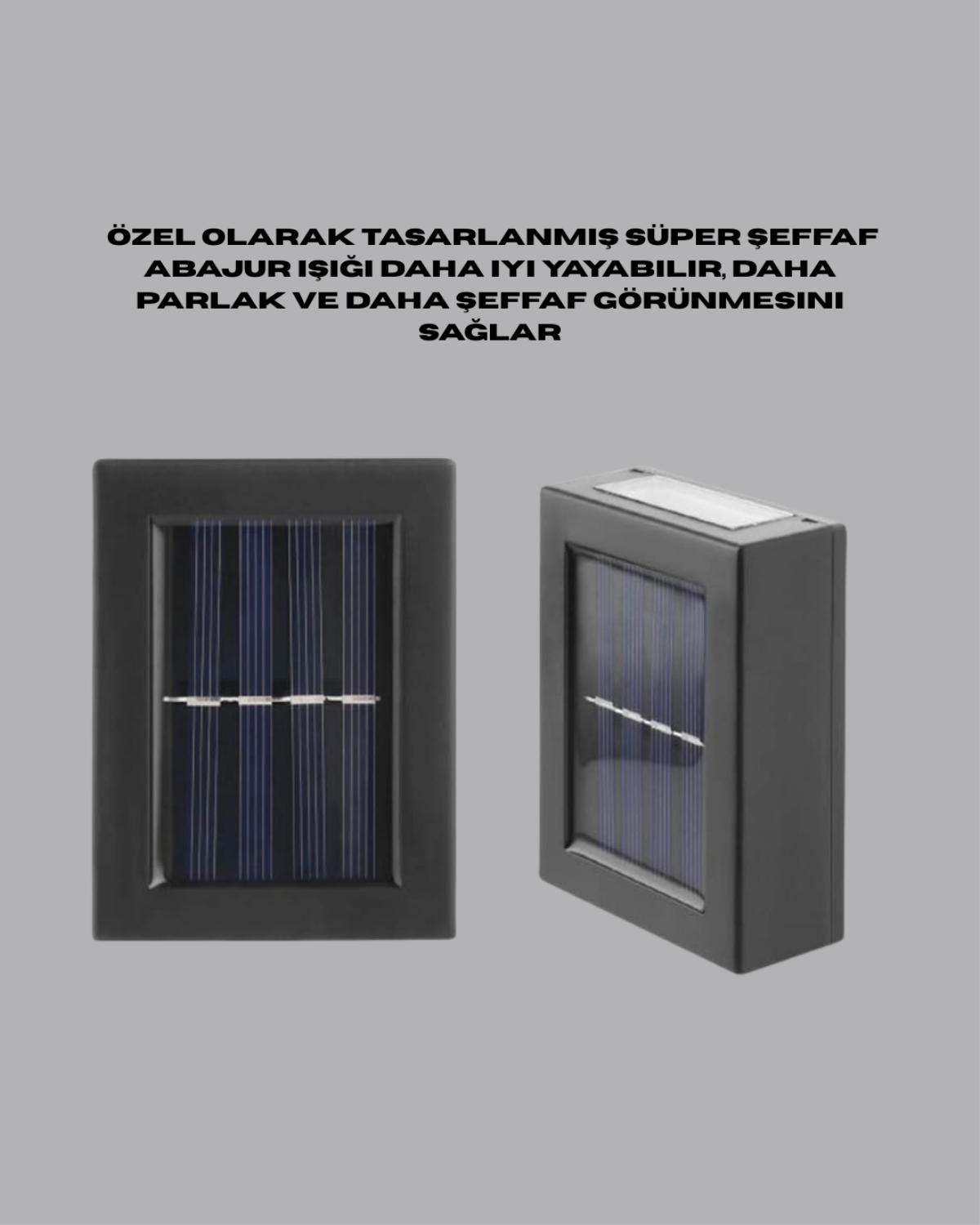 Bu LED duvar lambası, dış mekanlar için tasarlanmış, elektrik bağlantısına ihtiyaç duymadan çalışan güneş enerjili bir aydınlatma çözümüdür. Üzerindeki polikristalin silikon güneş paneli, gün boyunca enerjiyi verimli şekilde emer ve gece kullanım için 8 saatlik aydınlatma sağlar.