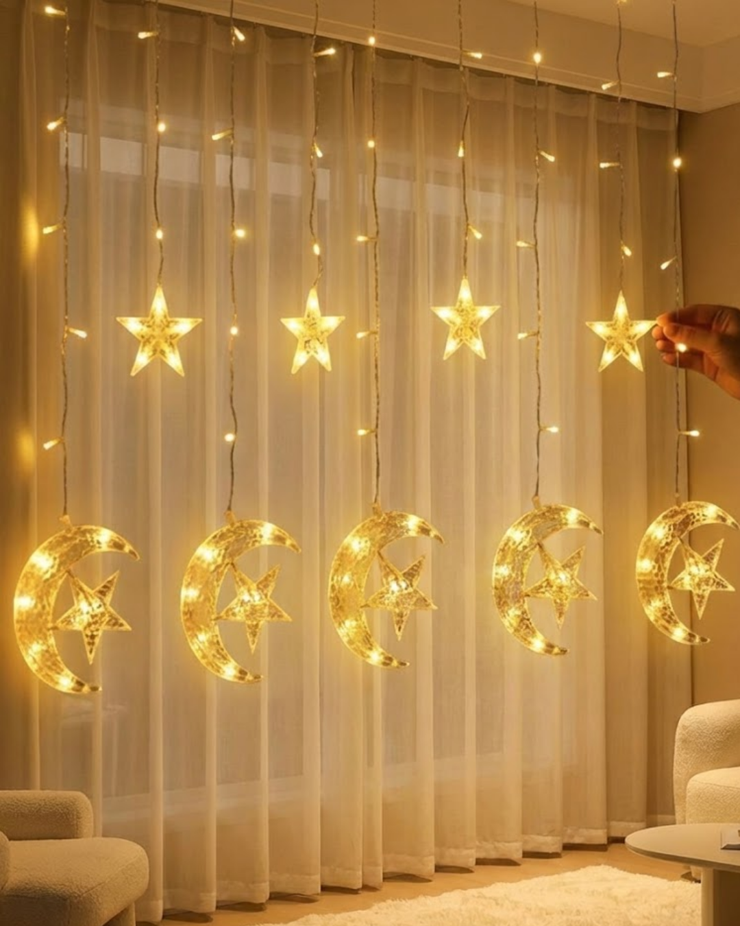 Hilal ve yıldız figürlü dekoratif perde ışık, yaşam alanlarınıza sadece bir aydınlatma değil, aynı zamanda duygusal bir ambiyans kazandırır. Sıcak beyaz tonuyla karanlık ortamda yumuşak ve romantik bir ışık yayarak bulunduğu mekâna huzurlu bir atmosfer oluşturur. Özellikle akşam saatlerinde tül perde önünde, pencere kenarında ya da duvar fonunda kullanıldığında ortama masalsı bir görünüm kazandırır.