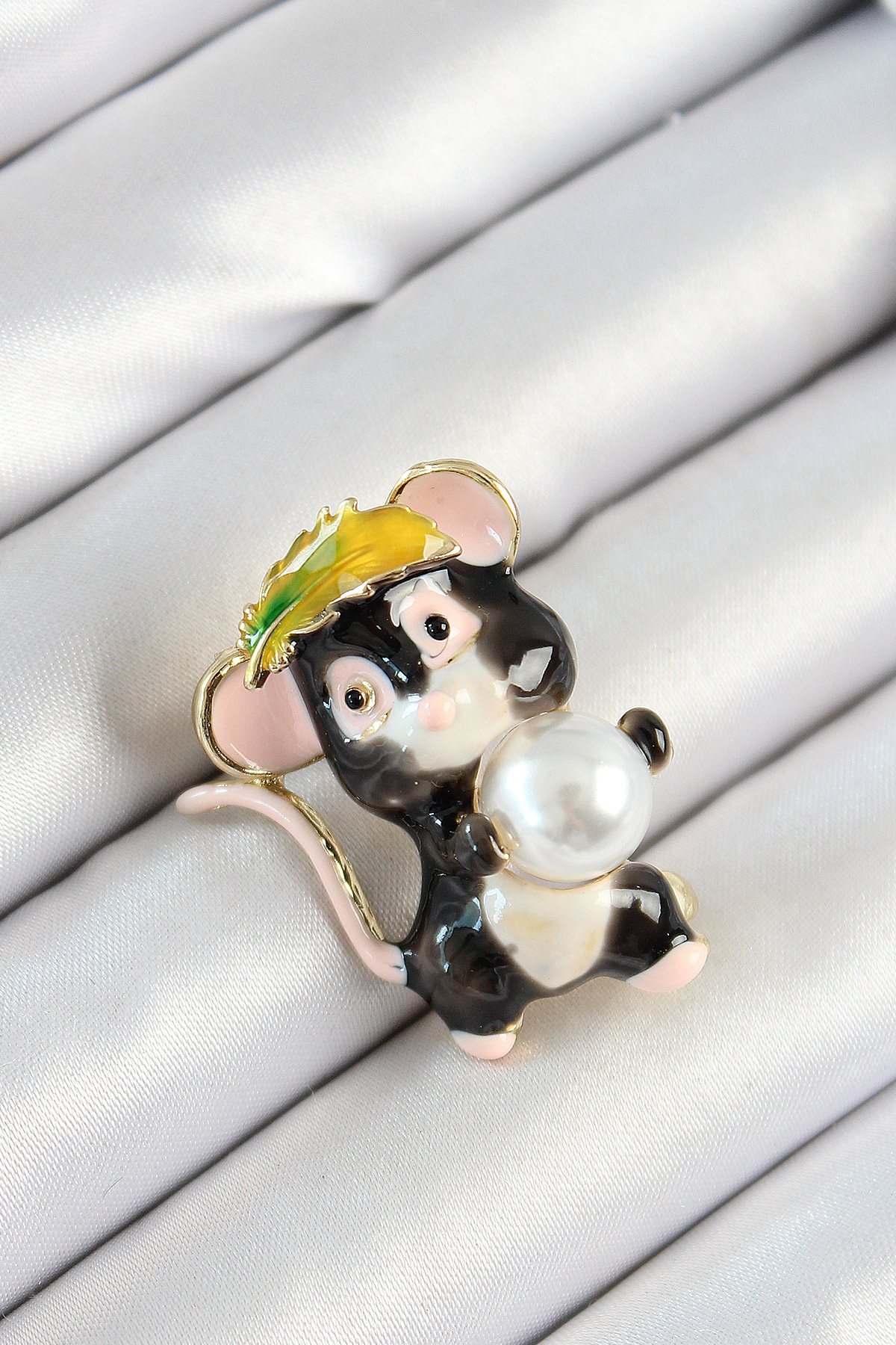 İnci Detaylı Siyah Ve Pembe 3D Sevimli Fare Figürlü Gold Renk Kadın Broş - TJ-BR437