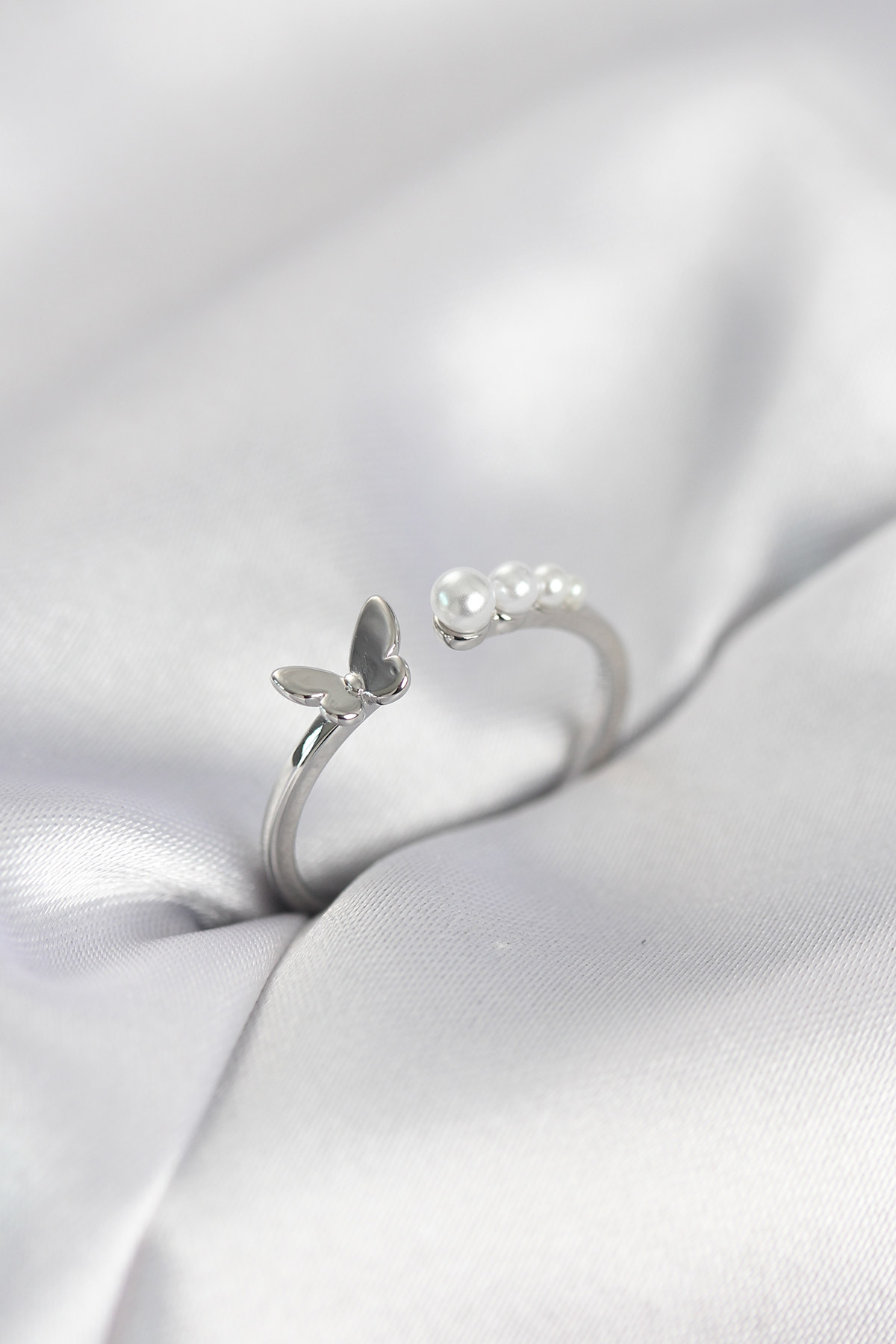 İncili Kelebek Model Gümüş Renk Pirinç Kadın Yüzük - TJ-BYK4120