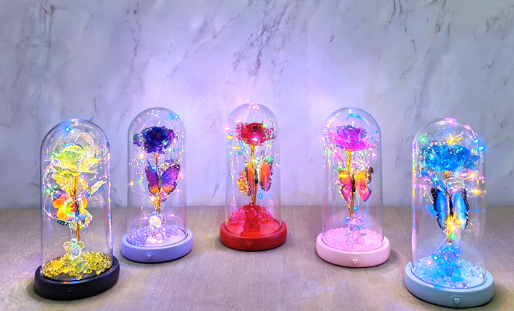 1 adet Işıklı Müzikli Romantik Kelebekli Fanus İçinde Gül