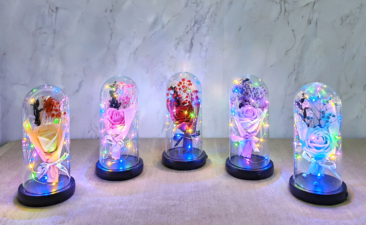Işıklı Müzkli Dekoratif Cam Fanus İçinde Gül