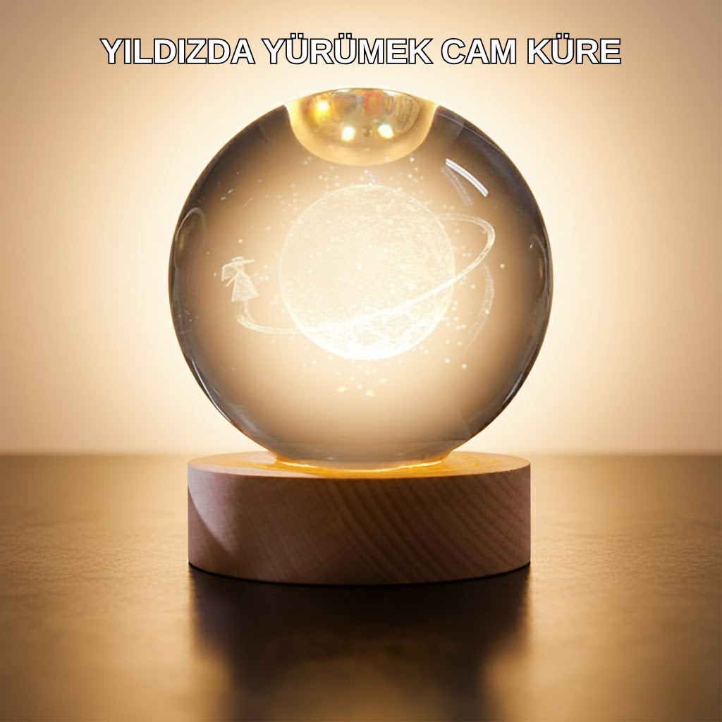 Büyük boy sarı cam küre, içindeki ışık efektiyle mekanlara sıcak bir atmosfer kazandırır. Küre üzerinde bulunan kız figürü, tasarıma masalsı bir dokunuş ekler. Ahşap standı sayesinde sağlam bir şekilde konumlandırılabilir ve dekoratif görünümü güçlendirir. Hem hediye alternatifi olarak hem de kişisel kullanım için ideal bir dekoratif ışıktır. Ortamı aydınlatırken aynı zamanda dekorasyon parçası olarak dikkat çeker.