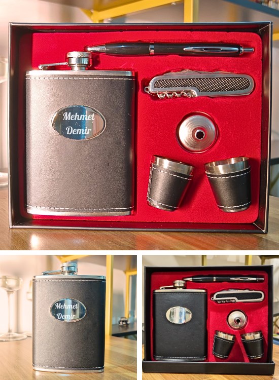 Muhteşem bir hediye seti; 7 oz luk matara, 2 shot bardağı, şık tükenmez kalemi ve çok işlevli çakı seti hediye kutusunda tüm sevdiklerinize hediye edebilirsiniz.