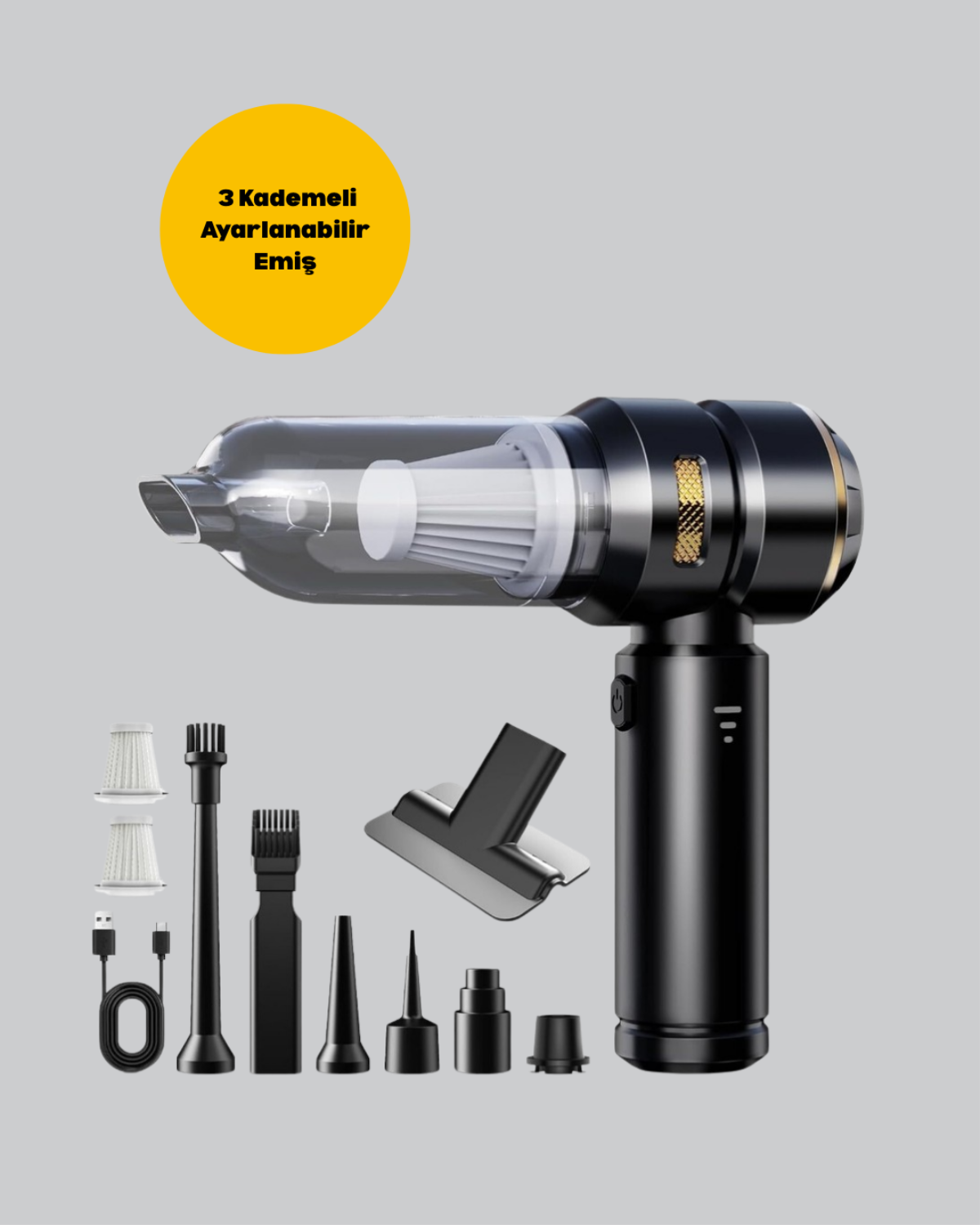 Kablosuz ve şarjlı kullanım avantajı sunan bu yüksek performanslı araç içi el süpürgesi, günlük temizlik ihtiyaçlarınıza profesyonel bir çözüm getiriyor. 15.000 PA’ya kadar ulaşan güçlü emiş kapasitesi sayesinde koltuk aralarına gizlenmiş tozları, kırıntıları ve en ufak partikülleri kolaylıkla çekiyor. Üç kademeli ayarlanabilir emiş gücü ile hem hafif tozlarda düşük kademeyi, hem de zorlu kirlerde yüksek kademeyi tercih edebilirsiniz. Üfleme modu sayesinde sadece süpürmekle kalmaz, aynı zamanda kirleri ve tozları üfleyerek temizleme imkânı da sunar. Bu özellik, bilgisayar klavyesi, havalandırma ızgaraları ve ulaşılması zor alanlarda mükemmel temizlik sağlar. HEPA filtre sistemi, havadaki en küçük partikülleri bile hapsederek daha hijyenik bir ortam sunarken yıkanabilir özelliğiyle uzun süreli kullanım imkânı verir. Kompakt ve hafif tasarımı, ergonomik tutma kolu ile birleşerek uzun süreli kullanımda bile yormaz. Sessiz motor teknolojisi sayesinde rahatsız edici bir ses çıkarmadan çalışır. Zengin başlık setiyle her ihtiyacınıza cevap veren bu süpürge, araç içi temizlikten evdeki küçük alanlara kadar hayatınızı kolaylaştıracak çok yönlü bir yardımcıdır.
