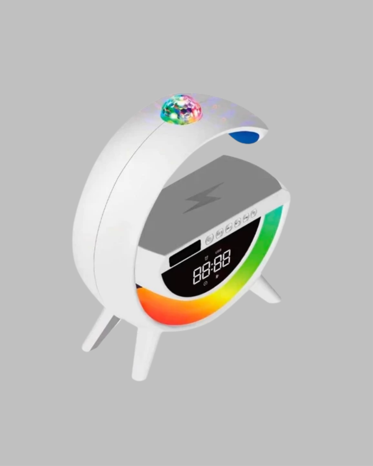 Medya kontrol tuşları ve ışık kontrol sistemi cihazı kolayca yönetebilmenizi sağlar. Hem işlevsel hem dekoratif olan bu hoparlör, günlük kullanım, gece lambası, masa saati ve kablosuz şarj ihtiyaçlarını tek gövdede birleştirerek mükemmel bir kullanıcı deneyimi sunar.