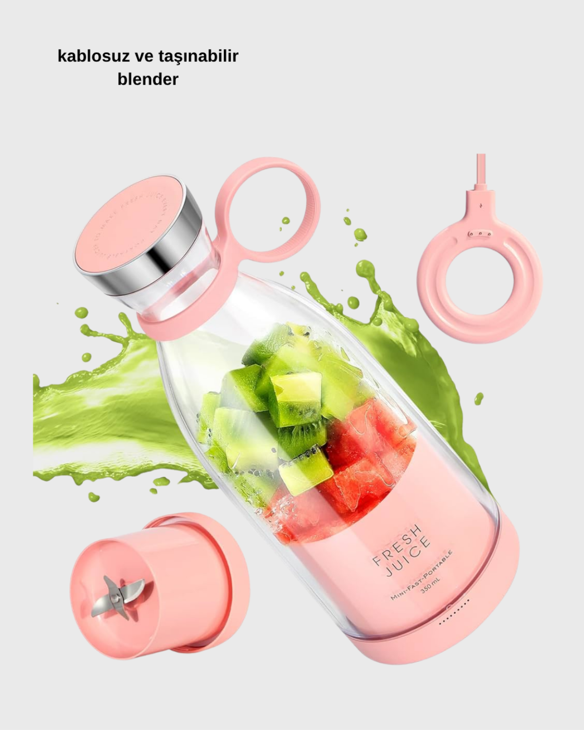 Bu kablosuz taşınabilir mini blender, günün her anında taze ve sağlıklı içecekler hazırlamak için tasarlandı! Kompakt boyutu (7,5 x 7,5 x 21 cm) sayesinde çantanıza kolayca sığar ve her yere taşınabilir. Gıda sınıfı, BPA içermeyen malzemeden üretilmiş olup sağlığınızı korurken çevreye de duyarlıdır.1200mAh şarjlı pili, tam dolumda 10 defaya kadar içecek hazırlama imkânı sunar. USB bağlantısı sayesinde bilgisayar, powerbank veya adaptörle kolayca şarj edilebilir. Portakal, karpuz, elma, muz, üzüm gibi meyveleri saniyeler içinde pürüzsüz içeceklere dönüştürür.Eşsiz güvenlik sistemi, yanlış montajda çalışmayı engeller ve güvenli kullanım sağlar. Şık pembe ve beyaz renk seçenekleriyle hem mutfakta hem ofiste tarzınızı yansıtır. Hafif, sessiz ve güçlü motoruyla sağlıklı yaşamın en pratik halini sunar.