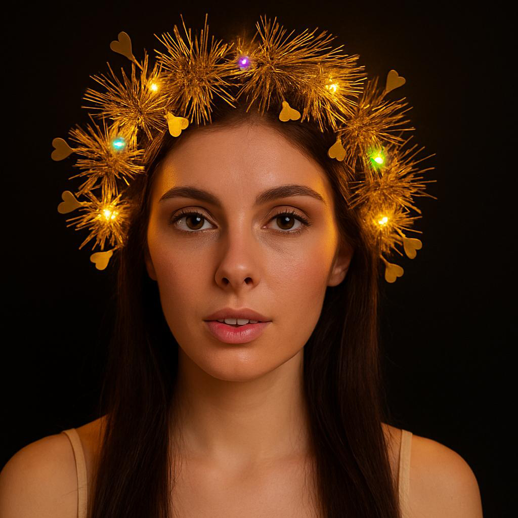 - 1 adet Kalp Püsküllü Gece Parıltısı 3 Modlu LED'li Işıklı Taç (Altın Renk)