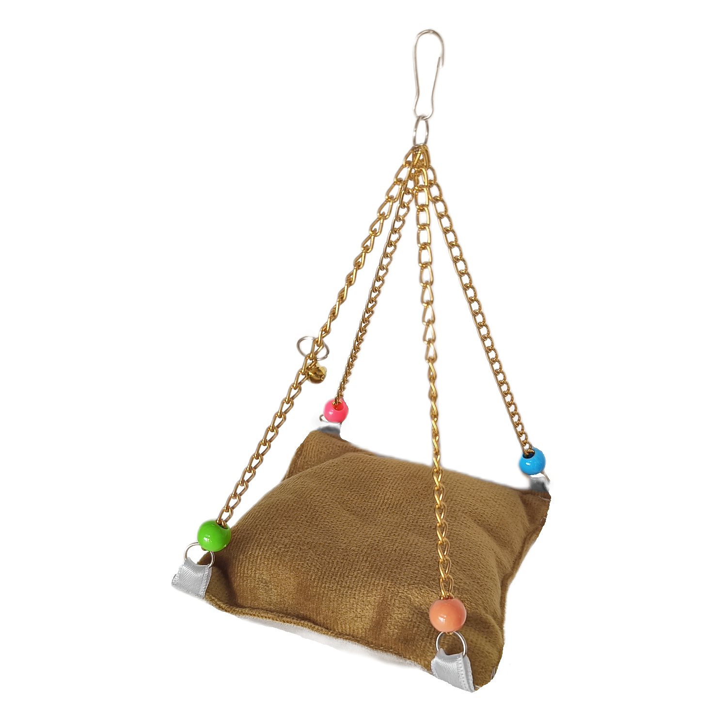 Çanlı ve minderli kuş salıncağıdır. Salıncağın ortasında askılı bir peluş minder bulunmaktadır. Renkli çan ve boncuklarla hazırlanan askısı ile şık bir görünüme sahiptir. Kuşlarınız bu oyuncaklarla hoş bir vakit geçirebilirler. Çanlı kuş hamağı sallanan minder tasarımı sayesinde kanatlı dostunuz için özel olarak üretilmiştir. Oyuncaklar zihinsel egzersiz oluşturması açısından yararli olup fiziksel egzersize teşvik eder. Farklı oyuncaklar kullanmak kuşun ilgisinin çeker, bu sebeple dönem dönem oyuncak değişikliği yapılması kanatlı dostunuzun sıkılmasını ve bunalıma girmesini önleyecektir.