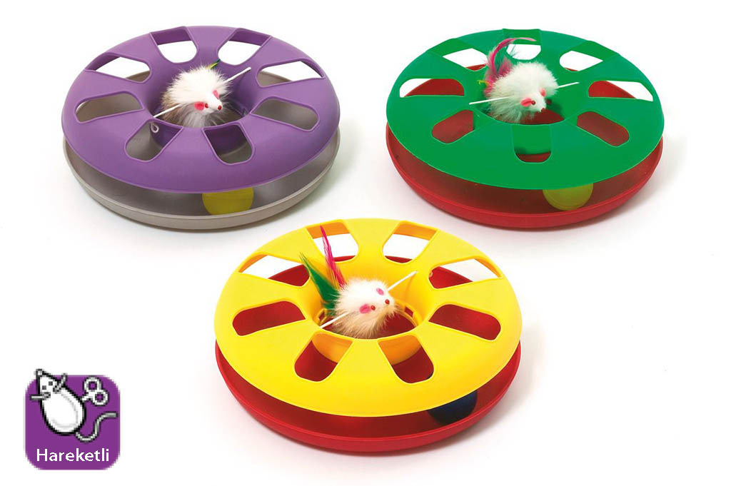 Peluş fareli ve toplu plastik kedi oyuncağı. 24 cm çapında. Çeşitli renklerde.