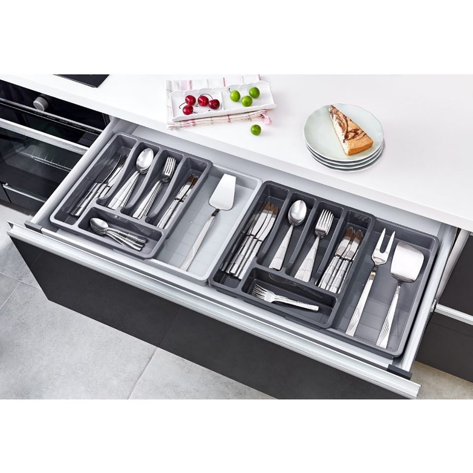 Kayar Kaşıklık Organizeri - 3 Aşamalı Sürgülü - Sağ Sol Açılır ; Kayar kaşıklık organizeri standart boyuttaki haznelere sığmayan masa, yemek kaşığı vb. gibi mutfak gereçlerinin düzenli bir şekilde çekmece içlerinde istiflenmesi için dizayn edilmiştir