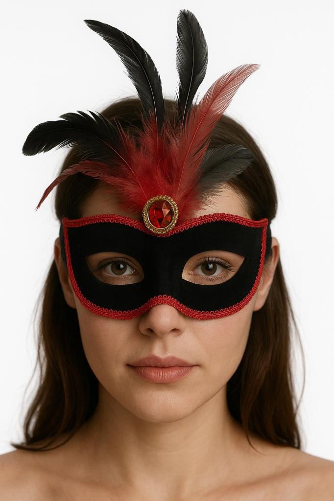 Balolar ve özel günler için mükemmel bir aksesuar olan Kırmızı Dantelli Siyah Kırmızı Tüylü Siyah Süet Kaplama Parti Maskesi ile gizemli ve etkileyici bir görünüm oluşturun!