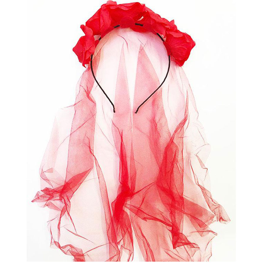 Kırmızı Renk Çiçekli Kırmızı Duvaklı Halloween Partisi Ürpertici Taç
