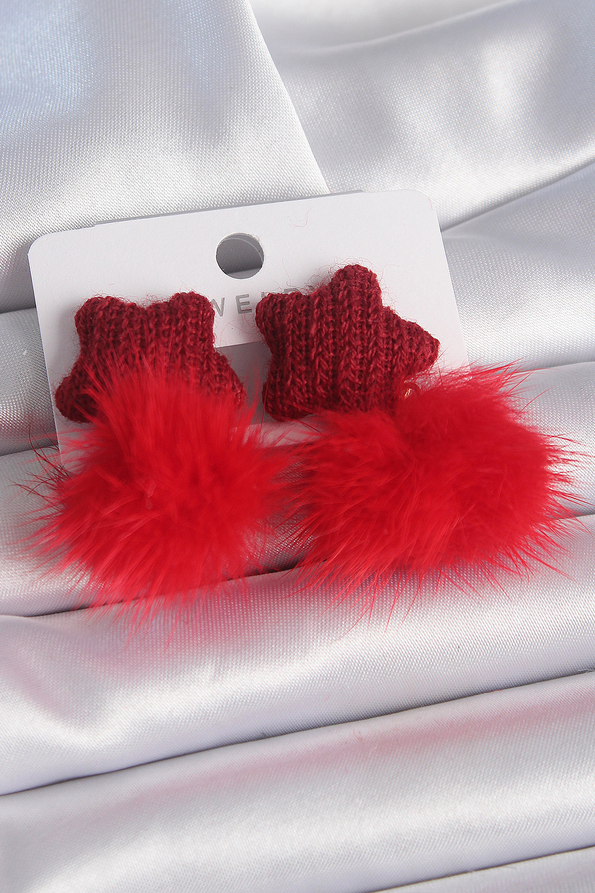 Kırmızı Renk Tüylü Yıldız Ponpon Model Kadın Küpe - TJ-BKP9556