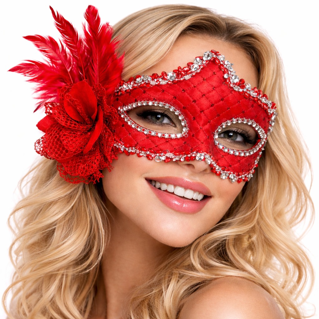 1 Adet Kırmızı Tüylü Venedik Lüks Balo Maskesi