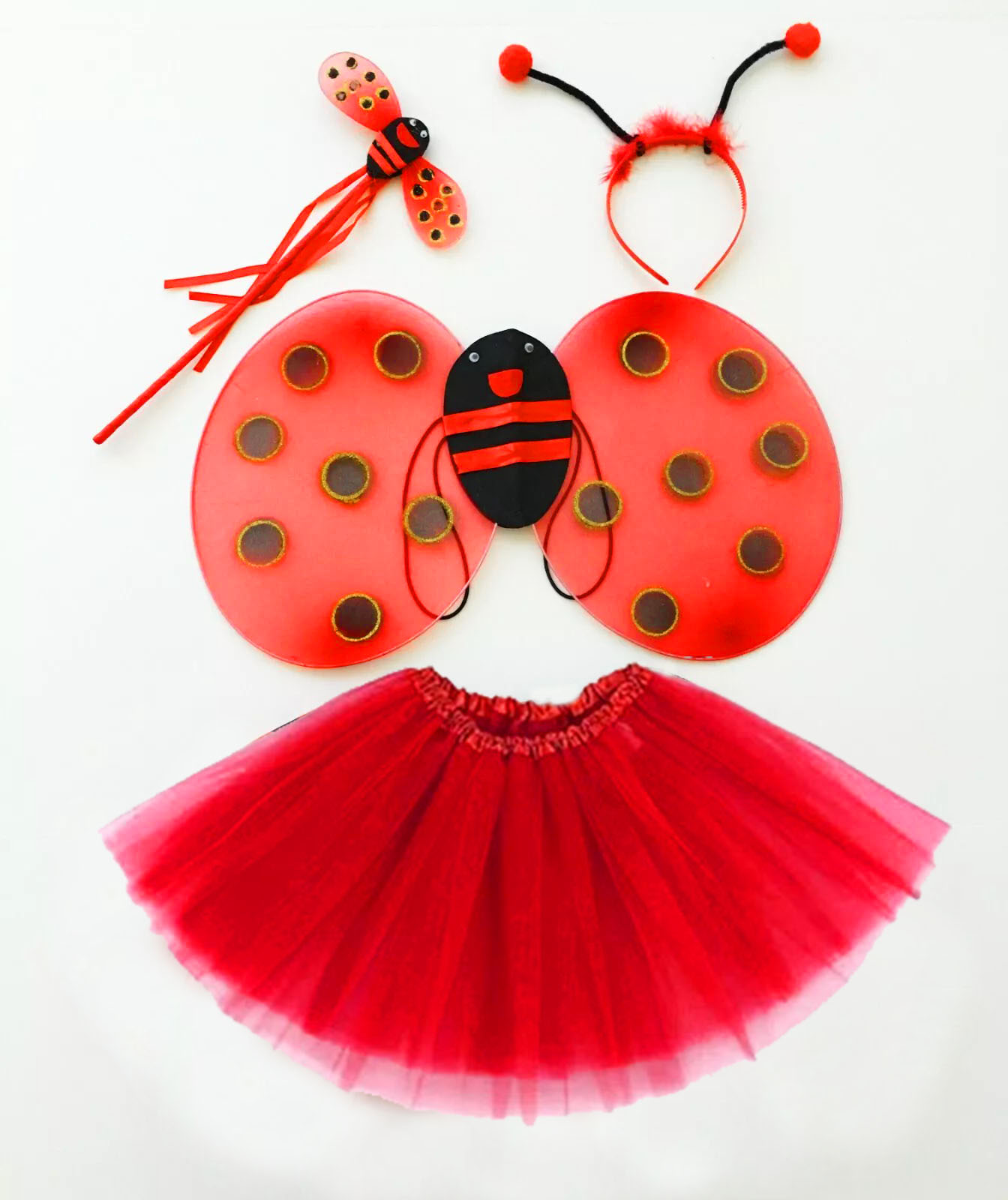 KIRMIZI UĞUR BÖCEĞİ KOSTÜM SETİ - TÜTÜ, KANAT, TAÇ, ASA