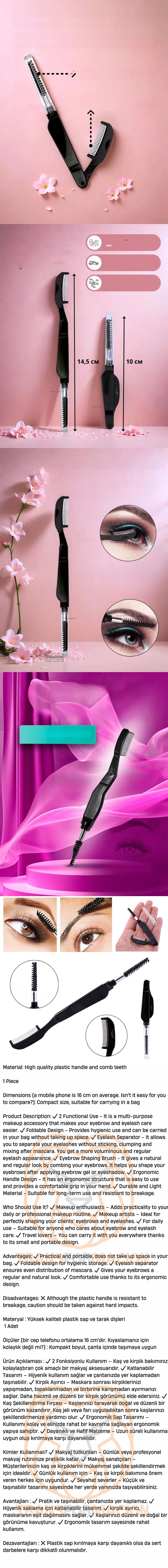 Avantajları : ✔ Pratik ve taşınabilir, çantanızda yer kaplamaz. ✔ Hijyenik saklama için katlanabilir tasarım. ✔ kirpik ayırıcı, maskaranın eşit dağılmasını sağlar. ✔ Kaşlarınızı düzenli ve doğal bir görünüme kavuşturur. ✔ Ergonomik tasarım sayesinde rahat kullanım.
