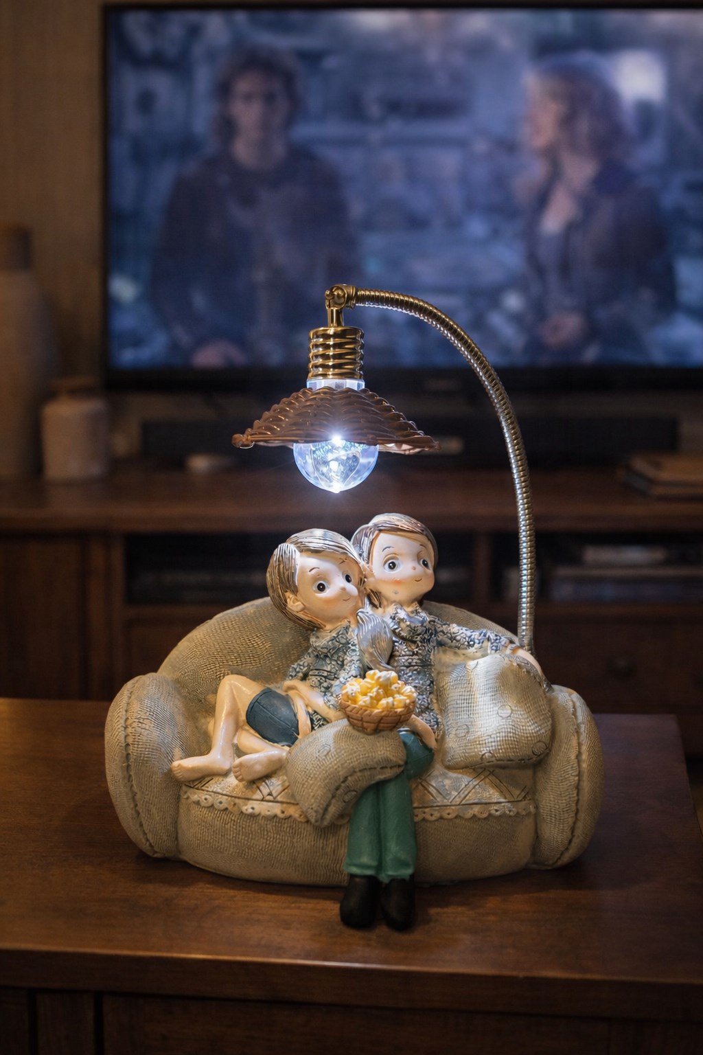 Film gecesi temalı çift figürü, yumuşak LED ışığıyla özellikle komodin ve yan sehpa üzerinde gece lambası olarak ideal bir kullanım sunar.