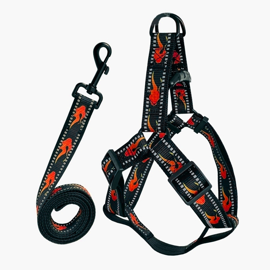 Göğüs çevresi 48-70 cm arasındaki köpekler için kullanabileceğiniz göğüs tasması ve 120 cm uzunluğundaki gezdirme kayışından oluşan tasma setidir. Göğüs tasması ve gezdirme kayışı bandı 2,5 cm genişliğindedir. Yüksek mukavemetli tasma setinin metal kısımları paslanmaz nikel kaplama olup kaliteli işçilik ile üretilmiştir. Klipsi açılarak ön bacaklara giydirililir ve göğüs bölgesi kavranarak sırt bölgesinde birleştirilerek kapatılır. Ayarlanabilir özelliği sayesinde ise sevimli dostunuza en uygun ölçü belirlenerek hem rahat etmesi hem de güvenilir olması sağlanır. Kaliteli mazlemeden üretilmiş olup gerek canlı renkte oluşu gerek se alev deseni ile şık bir görüntüye sahiptir. Reflektörlü & yansıtıcılı köpek tasma seti ile evcil hayvanınız daha güvende olacak. Trafikte ışık vurması ile görünürlük sağlayan reflektörlü tasma özellikle gece yürüyüşlerinde sizlere yardımcı olacak şekilde özel olarak tasarlanmıştır.