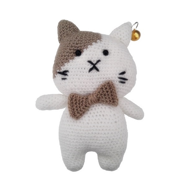 Örgü beyaz-kahverengi kedi, köpek oyuncağı olup kulağında çan küpe bulunmaktadır. İplerden özel olarak tasarlanmış çanlı beyaz-kahve renklerde örgü oyuncak, ilgi çekici bir oyuncak çeşididir. Kulağında bulunan çan sayesinde köpeğinizin oyuncağı hareket ettirmesiyle beraber ses çıkaracaktır böylece sevimli dostunuzun ilgisini kolayca çekecektir. Sağlam yapısı sayesinde kolay parçalanmaz ve beyaz-kahve renkte çanlı köpek oyuncağıdır. Sevimli dostunuza iyi bir arkadaş olacak beyaz-kahve renklerde kombine edilmiş örgü kedi 16 cm uzunluğundadır. Papyonlu sevimi kedi oyuncak.