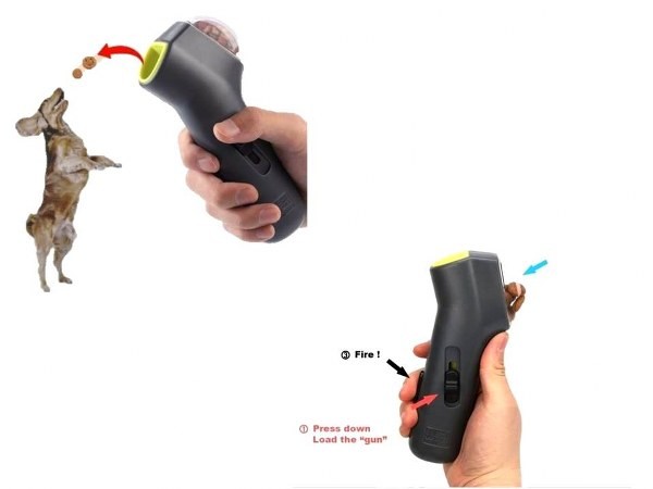 Mama fırlatma tabancası şeklindedir ve ön tarafta bulunan 40 ml hacimli şeffaf bölüme ödül maması veya kuru mama konulabilir.