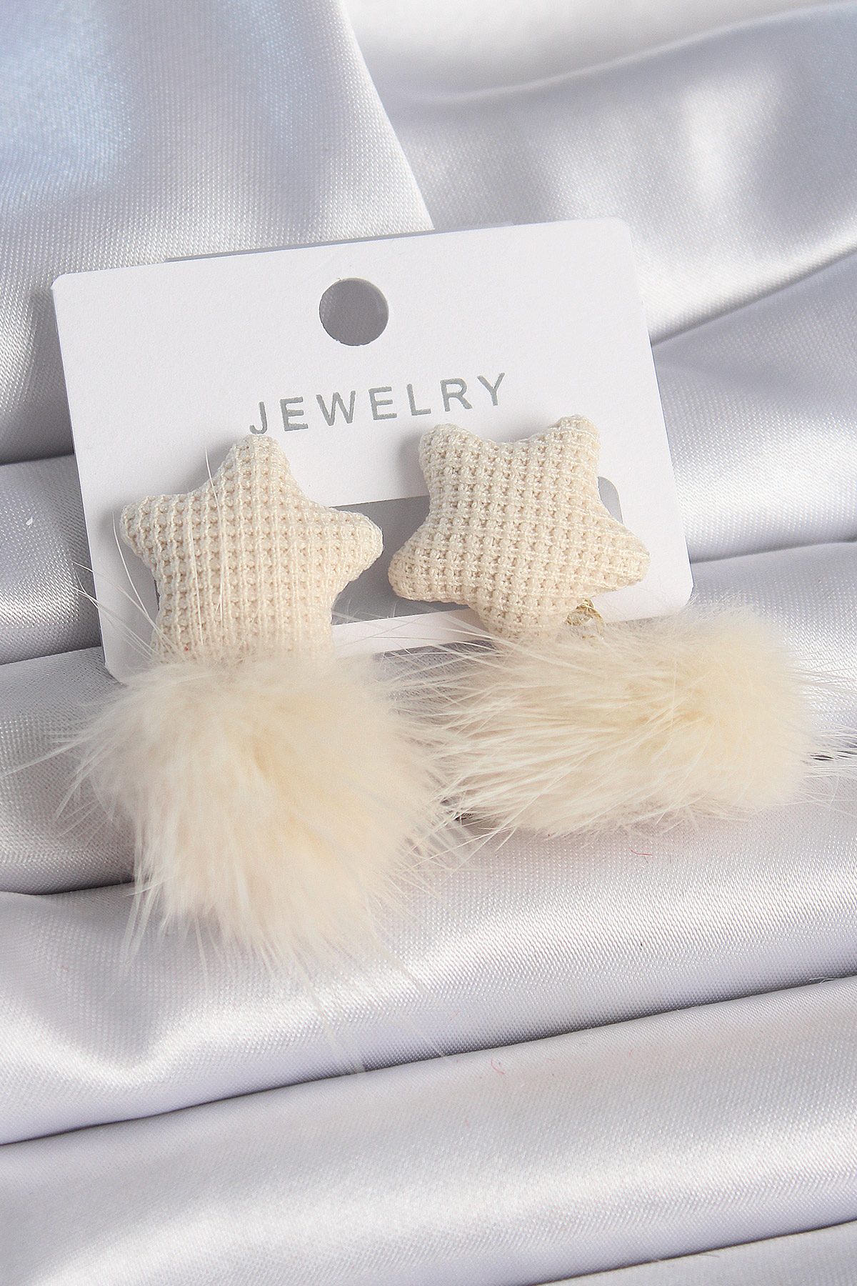 Krem Rengi Tüylü Ponpon Model Kadın Küpe - TJ-BKP9554