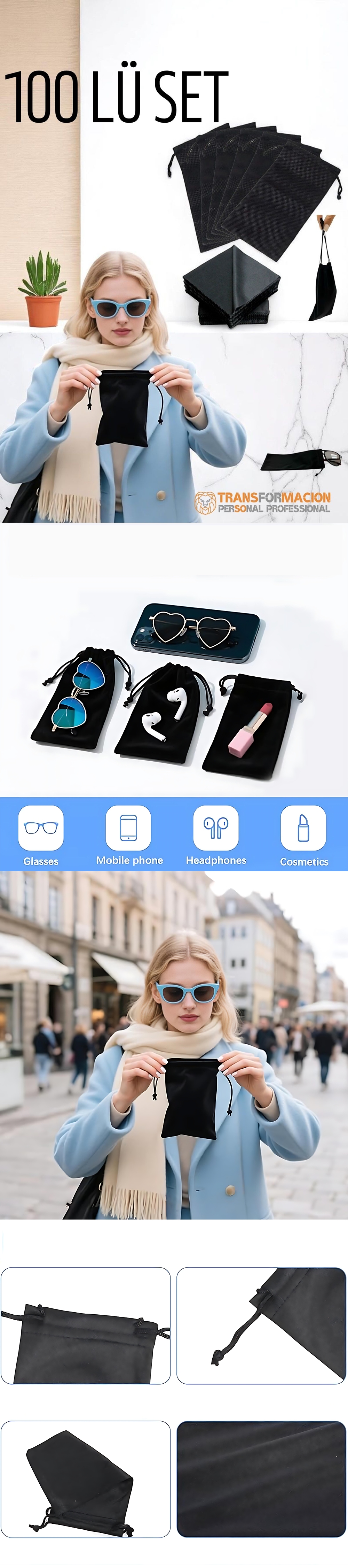 Bu TRANSFORMACION Profesyonel Çekme İpli Gözlük Kılıfı, gözlüklerinizi çizilmelere ve toza karşı korumak için özel olarak tasarlanmıştır. Yumuşak ve dayanıklı kumaş malzemesi, gözlüklerinizi güvenli şekilde saklamanıza olanak tanırken, çekme ipli tasarımı kolay kullanım sağlar. Bu ürün 50'li set olarak satılmaktadır, yani tek siparişle 50 adet gözlük kılıfı gönderilir. Ayrıca 50 adet silme bezi hediyesi ile birlikte gelir, böylece gözlük camlarınızı çizmeden temizleyebilirsiniz!