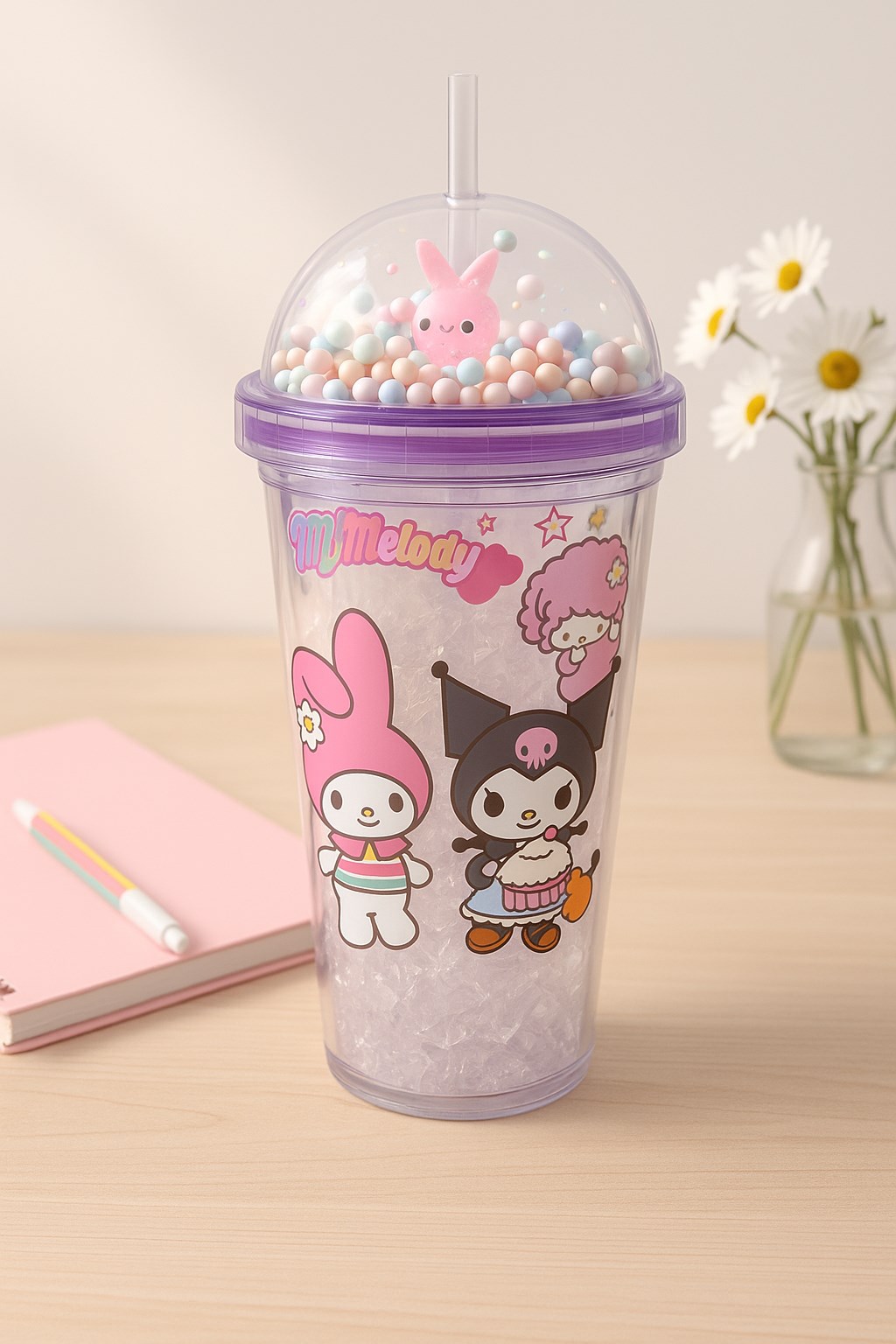 Renkli tasarımı ve ışıltılı detaylarıyla bu kuromi temalı bardak, çocukların ve gençlerin favorisi olacak. Hem eğlenceli hem de pratik yapısıyla içecek saatlerine neşe katıyor.