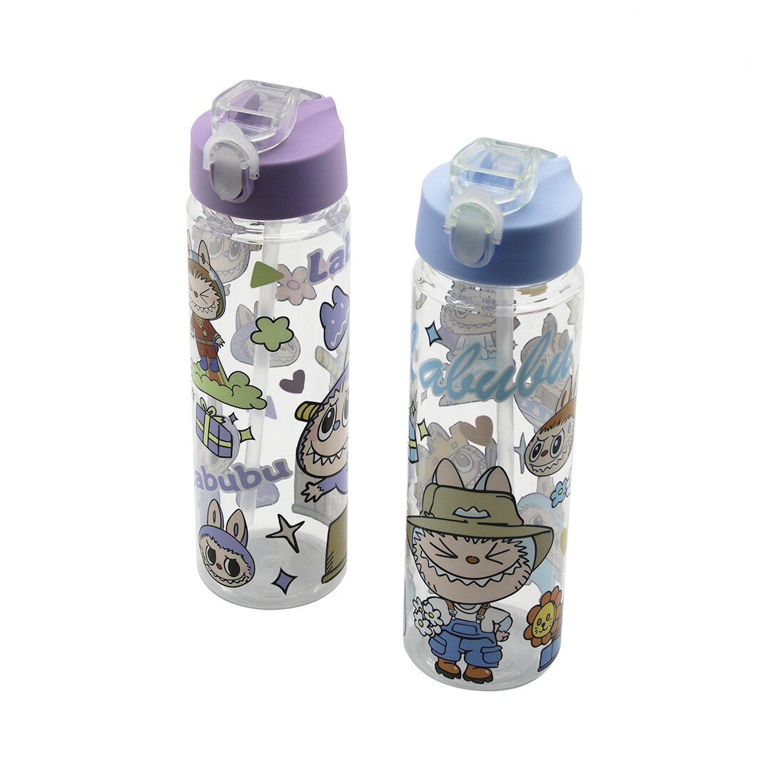LABUBU ÇOCUK ÇİZGİ FİLM KARAKTER RESİMLİ SU MATARASI ŞEFFAF PLASTİK PİPETLİ KİLİTLİ KAPAK