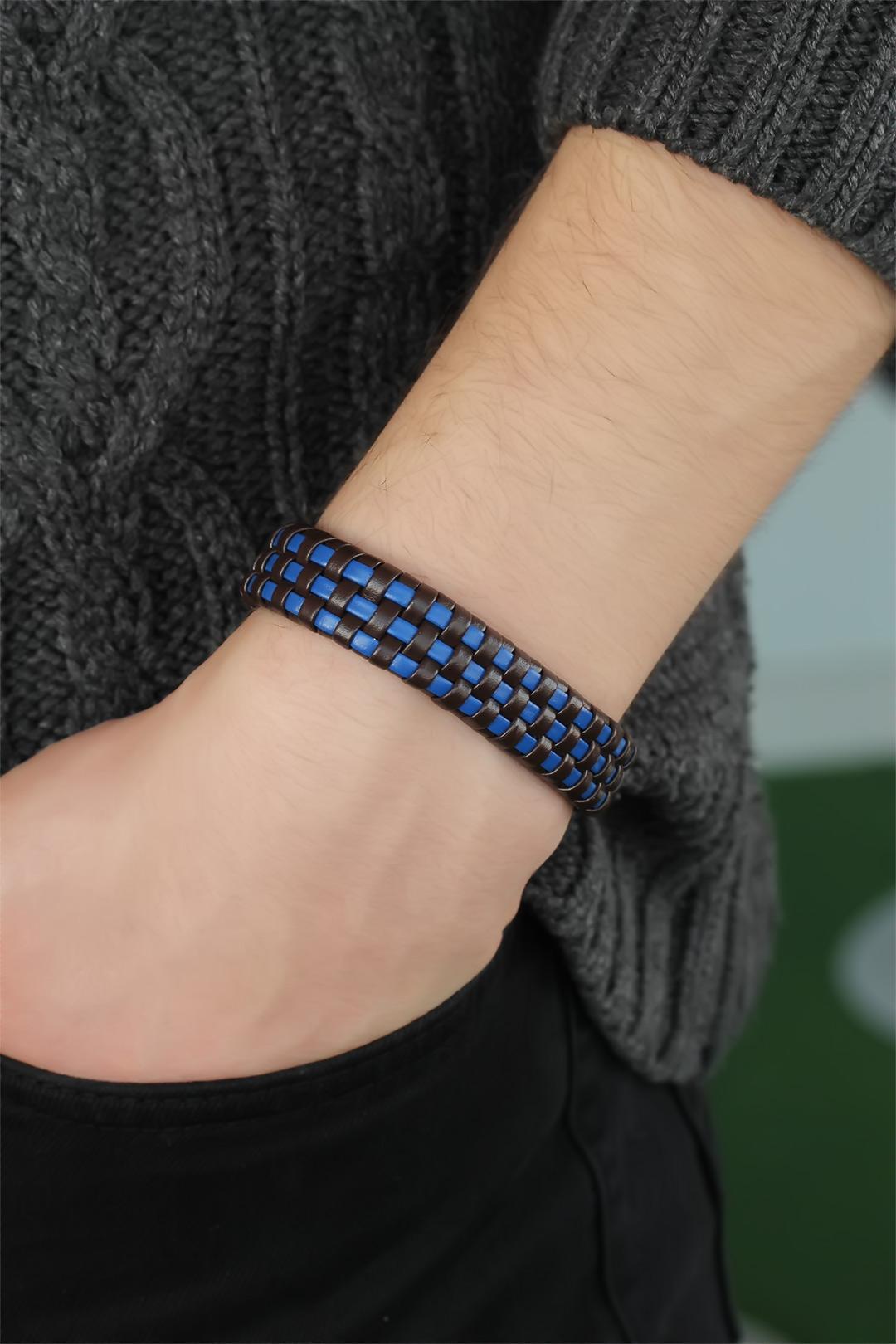 Lacivert Damalı Deri Erkek Bileklik - TJ-EB2749-KS