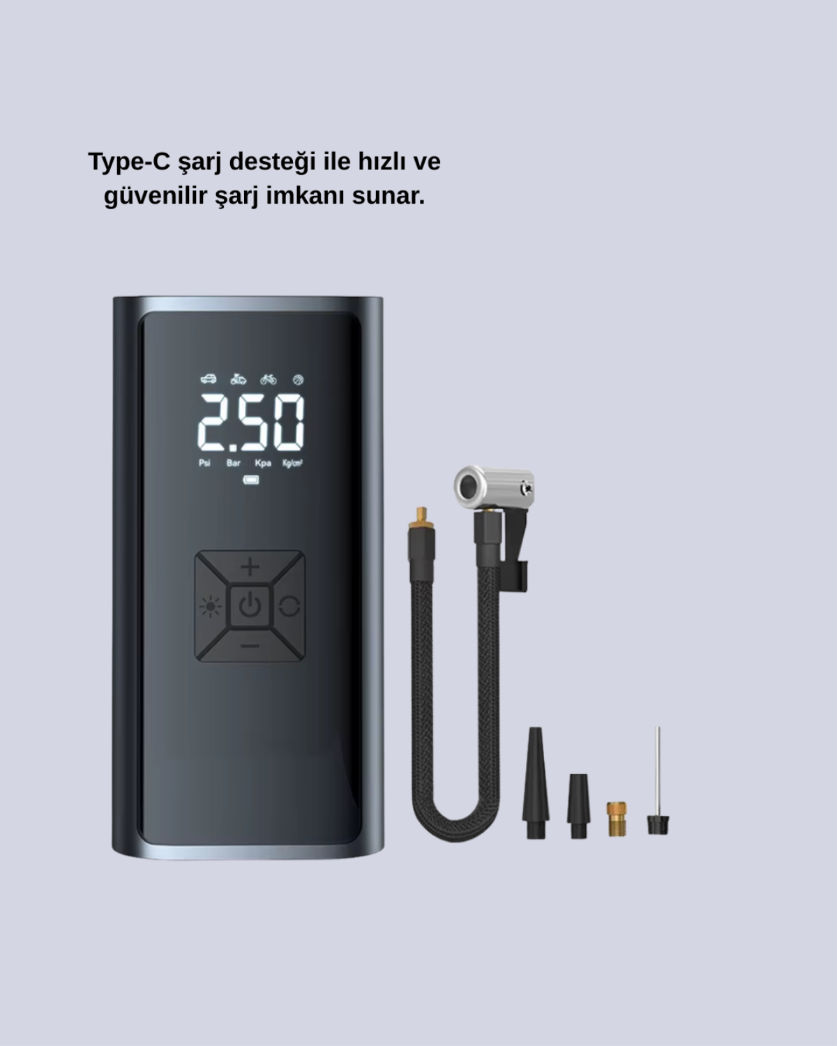 Bu çok fonksiyonlu cihaz, sadece lastik şişirmekle kalmaz, şişme yatak, can yeleği ve spor ekipmanları için de kullanılabilir. Hem günlük kullanımda hem de acil durumlarda en güvenilir yardımcınız olacaktır.