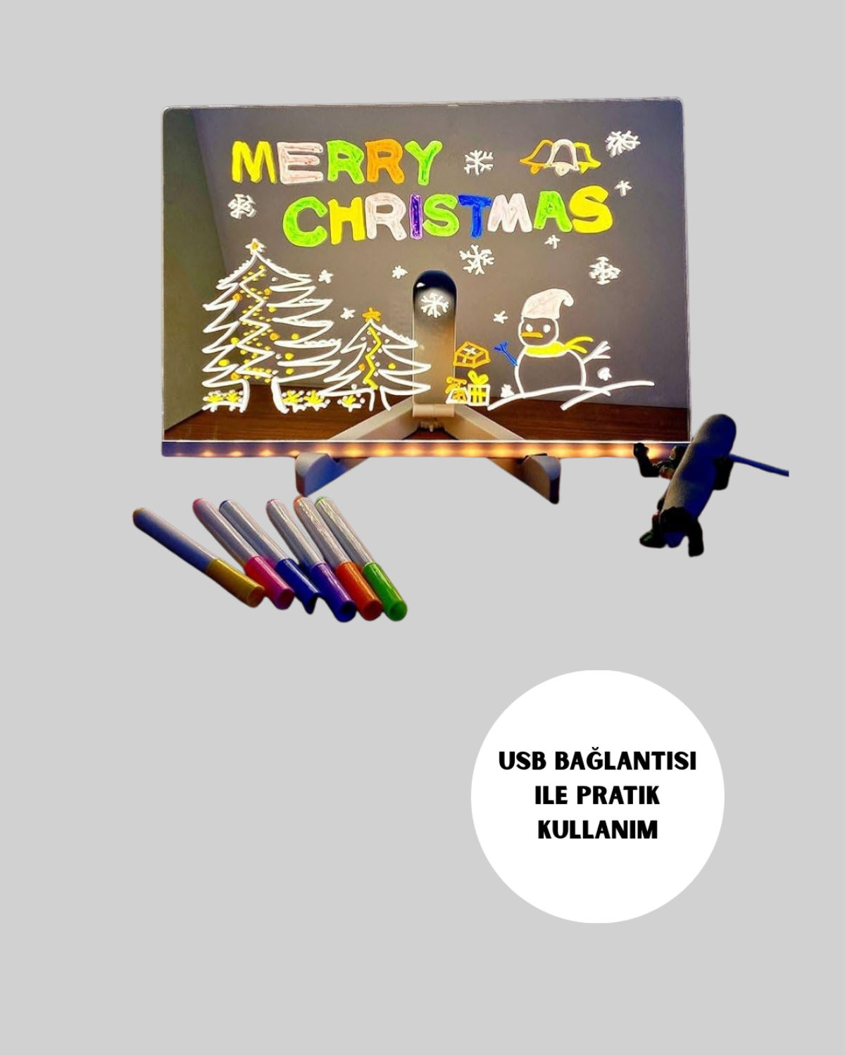 LED ışıklı akrilik yazı panosu, yaratıcı fikirlerinizi renkli bir şekilde ifade etmenizi sağlar. Canlı ve parlak LED ışıkları sayesinde mesajlarınız, çizimleriniz veya notlarınız her ortamda dikkat çeker. USB bağlantısı sayesinde kolayca şarj edilebilir ve sürekli enerji sağlar. Ayarlanabilir standı ile masaüstünde kullanabilir veya duvara monte ederek dekoratif bir aksesuar haline getirebilirsiniz. Kuru silinebilir yüzeyi sayesinde istediğiniz an yeni mesaj yazabilir, çocuğunuzun çizimlerini tazeleyebilirsiniz. Paket içinde yer alan 7 farklı renkli kalem, yaratıcılığınızı sınırlandırmadan özgürce kullanabilmenize olanak tanır. Çocukların eğlenirken öğrenmesi, yetişkinlerin ise ofis ya da evde pratik notlar alması için mükemmel bir üründür.