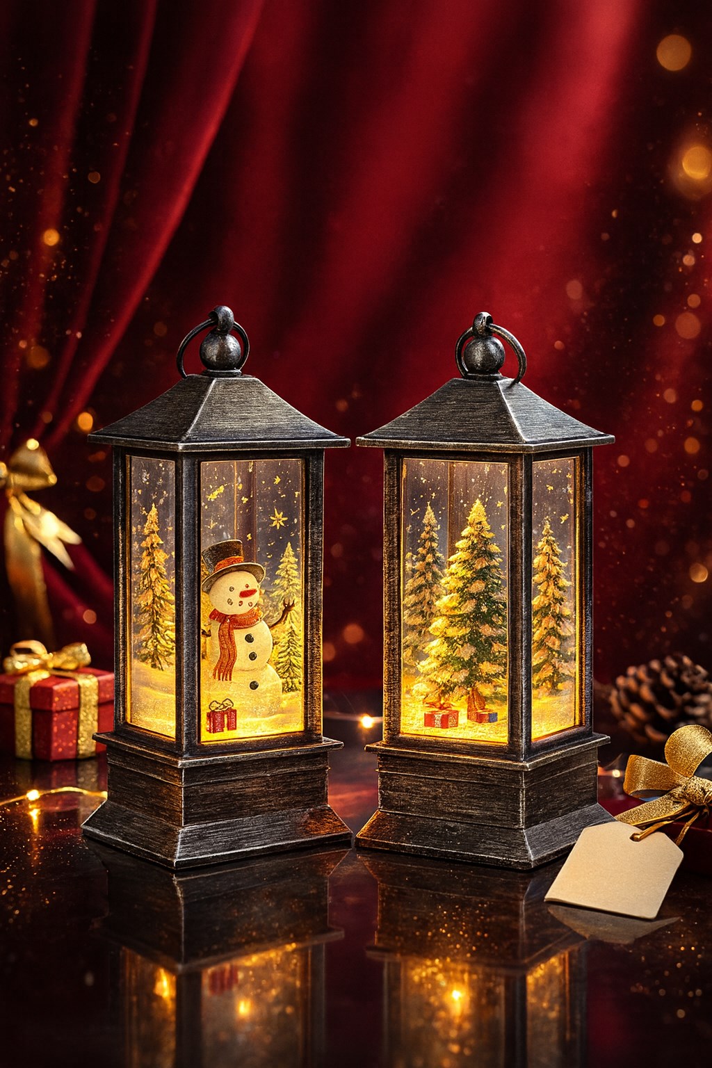 2’li set: 1 adet kırmızı çam ağacı temalı, 1 adet gri Kardan Adam temalı fener