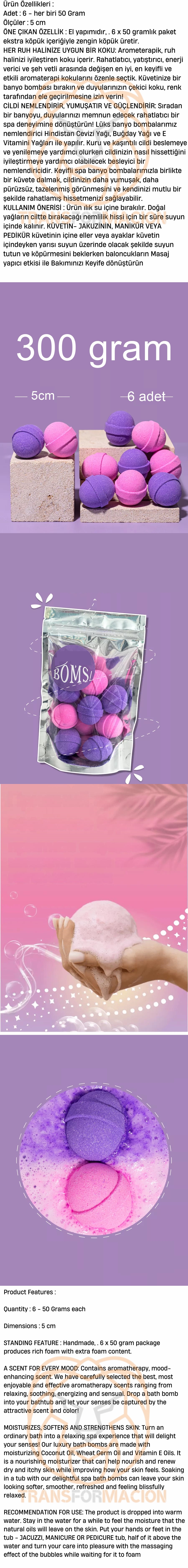 CİLDİ NEMLENDİRİR, YUMUŞATIR VE GÜÇLENDİRİR: Sıradan bir banyoyu, duyularınızı memnun edecek rahatlatıcı bir spa deneyimine dönüştürün! Lüks banyo bombalarımız nemlendirici Hindistan Cevizi Yağı, Buğday Yağı ve E Vitamini Yağları ile yapılır. Kuru ve kaşıntılı cildi beslemeye ve yenilemeye yardımcı olurken cildinizin nasıl hissettiğini iyileştirmeye yardımcı olabilecek besleyici bir nemlendiricidir. Keyifli spa banyo bombalarımızla birlikte bir küvete dalmak, cildinizin daha yumuşak, daha pürüzsüz, tazelenmiş görünmesini ve kendinizi mutlu bir şekilde rahatlamış hissetmenizi sağlayabilir.